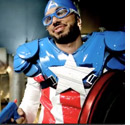 up in homemade “Avengers” costumes. The agent dressed as Captain America exclaims, “We’re the superheroes of insurance!” Professor Burke then takes his plastic gun and