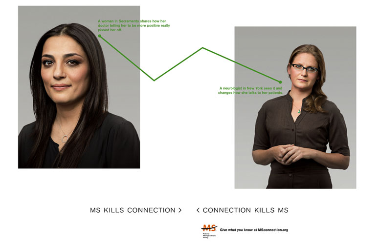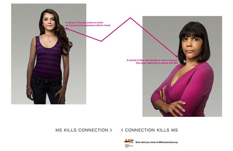 Kennedy created a campaign for The National Multiple Sclerosis Society called "MS Kills Connection. Connection Kills MS." The print campaign shows how seemingly small