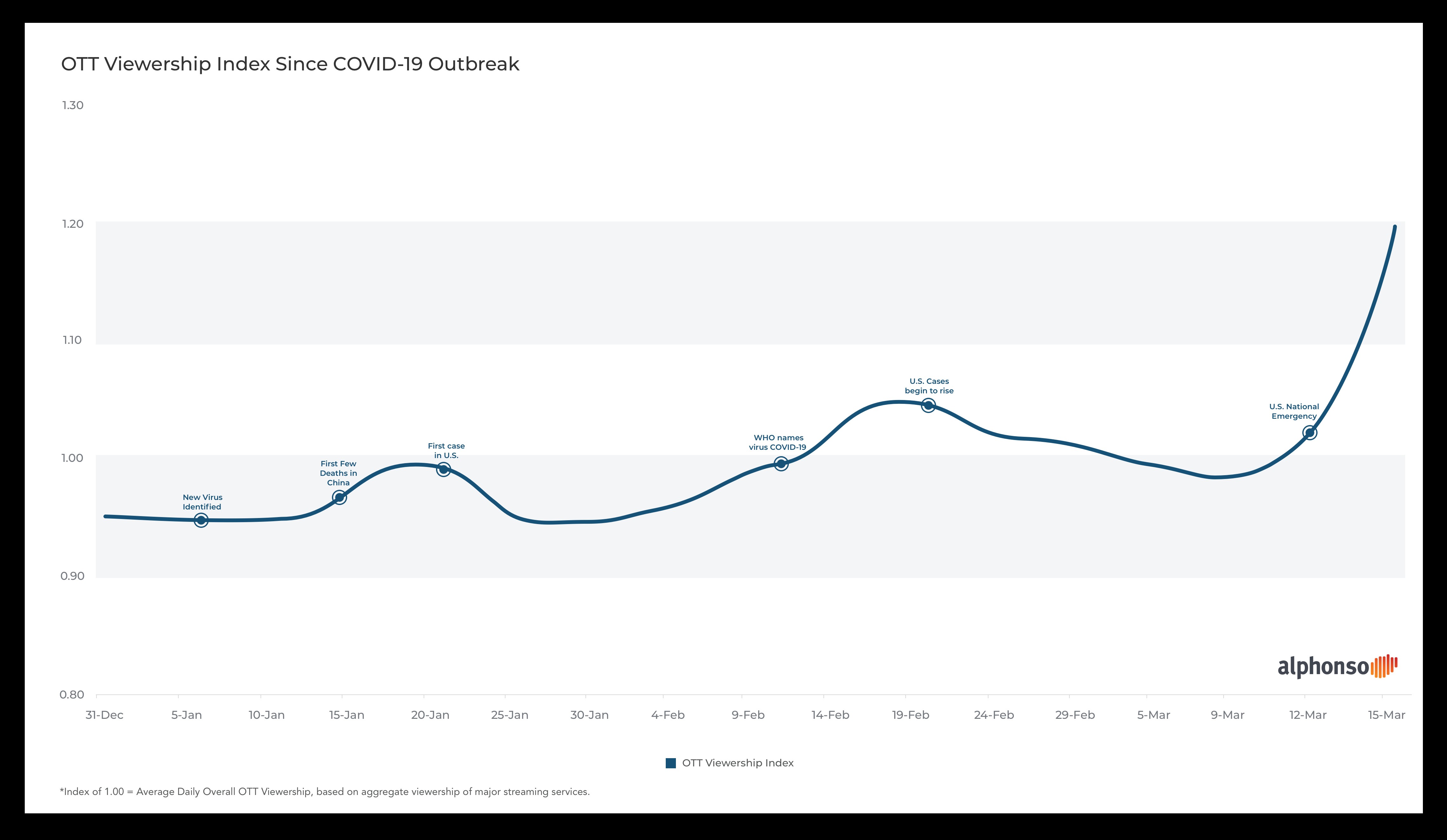 COVID-19 infection curve federal and state governments are struggling to flatten, but one provided by TV analytics firm Alphonso showing how stuck-at-home Americans are consuming record amounts of OTT