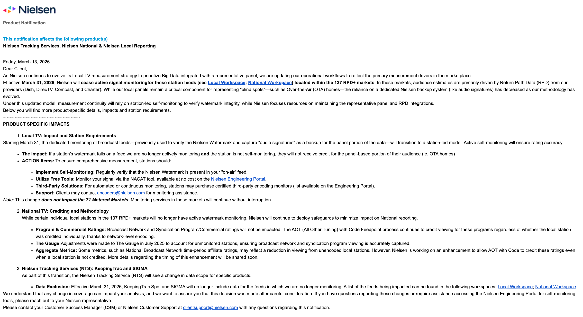workflows to reflect the primary measurement drivers in the marketplace,” Nielsen said in the notice sent to