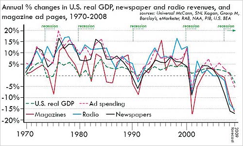The fixes are in for 2009, and it's looking pretty bad for traditional media in America. Various forecasts have ad revenues for radio, magazines, … Read the whole story