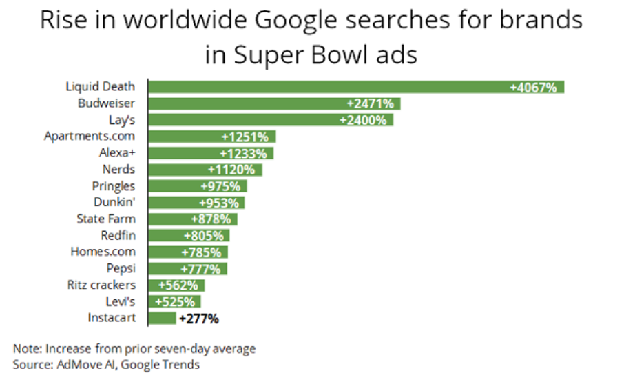 The study analyzed worldwide Google Trends data for every major brand that advertised during the game, ranking commercials by the jump in searches over the past seven days. In a year when a 30-second Super Bowl ad cost about $8 million, the metric offers a simple gut check for media buyers wondering who actually broke through and who just bought a very expensive vibe.