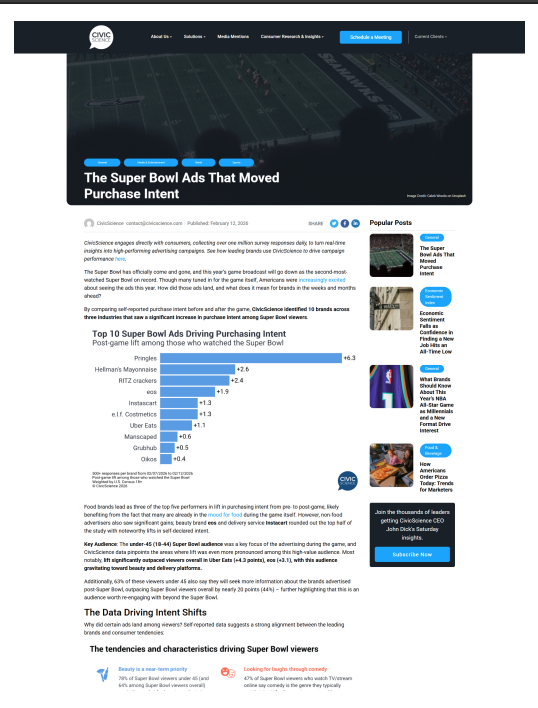 If you needed proof that America will impulse buy anything after three hours of football and finger food, CivicScience has receipts. In its new report, the research firm found that 10 brands saw meaningful lifts in self-reported purchase intent after the big game. Pringles led the pack with a +6.3 point bump among viewers, followed by Hellmann’s Mayonnaise at +2.6 and Ritz crackers at +2.4, according to the report. Yes, the snack table is undefeated.