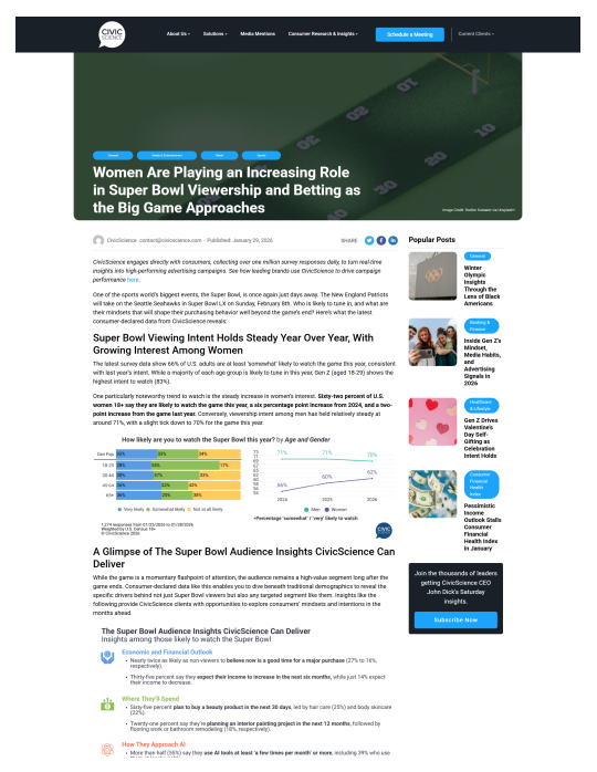 If your Super Bowl media plan still assumes the audience is mostly men arguing about fourth downs and wings, CivicScience has some gentle but urgent news: women are very much in the building, and they are increasingly driving how the Big Game is watched, wagered on and monetized .