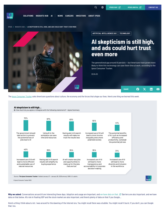 Americans remain deeply conflicted about artificial intelligence, according to Ipsos, and that tension matters a lot for advertisers.